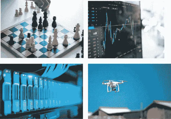 图 11.1。强化学习的实际应用示例。左上:解决象棋和围棋等棋类游戏。右上:进行算法交易。左下:数据中心的自动资源管理。右下:机器人的控制和行动规划。所有图像均为免费许可证,并从www.pexels.com下载。