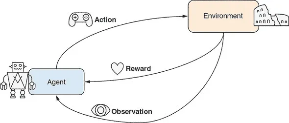 图 11.2 描绘了强化学习问题的主要组成部分。代理是我们(强化学习从业者)直接控制的对象。代理(例如在建筑物中收集垃圾的机器人)以三种方式与环境交互: