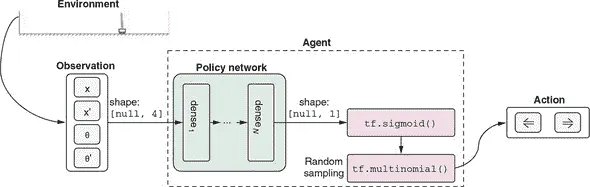 我们如何让代理在每一步决定动作(向左还是向右的力)?鉴于代理可用的观察和代理每一步需要做出的决定,这个问题可以被重新制定为一个简单的输入输出映射问题,就像在监督学习中那样。一个自然的解决方案是构建一个神经网络,根据观察来选择一个动作。这是策略网络背后的基本思想。