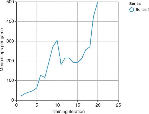 要看到 REINFORCE 算法的运行情况,请在演示页面上指定 25 个时期,并单击“训练”按钮。默认情况下,训练期间实时显示环境的状态,以便您可以看到学习代理的重复尝试。要加快训练速度,请取消选中“训练期间渲染”复选框。在合理更新的笔记本电脑上,25 个时期的训练需要几分钟,并且应足以达到天花板性能(默认设置下游戏每轮 500 步)。图 11.7 显示了典型的训练曲线,该曲线将平均每轮长度作为训练迭代的函数绘制出来。请注意,训练进度显示出一些戏剧性的波动,平均步数随着迭代次数以非单调和高度嘈杂的方式变化。这种波动在强化学习训练工作中并不罕见。