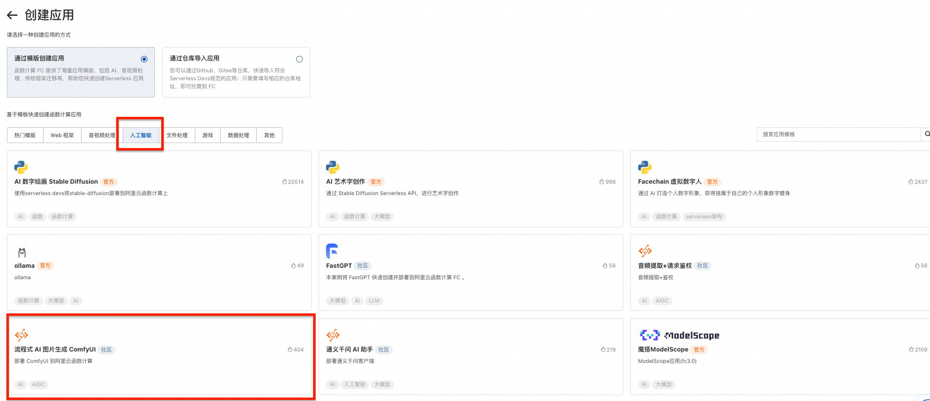 点击“创建应用”进入应用应用中心,选择 人工智能分类—流程式 AI 图片生成 ComfyUI ,点击立即创建
