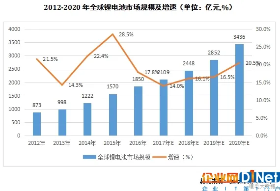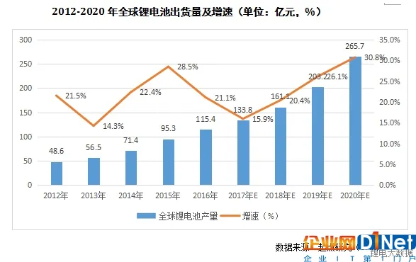 起点研究(SPIR)统计数据显示,2016年全球锂电池电芯产值达到1850亿元,同比2015年增长17.8%。预计到2020年全球锂电池电芯产值将达到3436亿元。