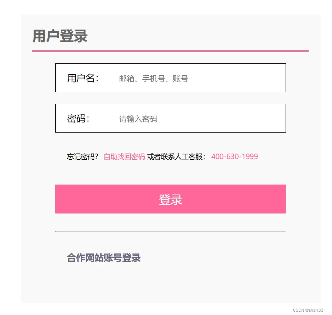 <!DOCTYPE html> <html lang="en"> <head> <meta charset="UTF-8"> <meta name="viewport" content="width=device-width, initial-scale=1.0"> <title>登陆页面</title> <link rel="stylesheet" href="../css/01.css"> </head> <body> <div class="box"> <h2>用户登录</h2> <hr> <form action=""> <div class="box1"> <label for="">用户名:</label> <input type="text" placeholder="邮箱、手机号、账号"> </div> <div class="box1"> <label for="">密码:</label> <input type="password" placeholder="请输入密码"> </div> <div class="box1 boxp"> <p>忘记密码? <span>自助找回密码</span> 或者联系人工客服: <span> 400-630-1999</span> </p> </div> <input type="button" value="登录" class="dl"> <hr class="hs"> <div class="box1 boxp1"> <h4>合作网站账号登录</h4> </div> </form> </div> </body> </html>