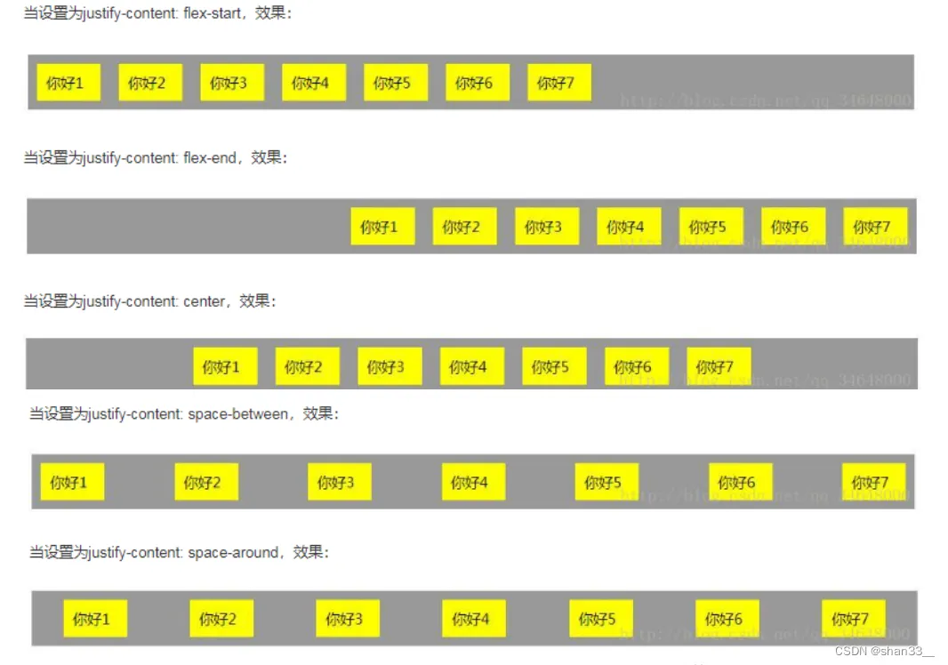 - justify-content的属性值包括flex-start、flex-end、center、space-between、space-around,默认属性值为flex-start,