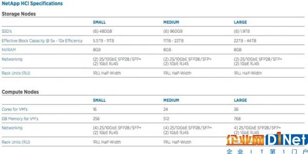 这些设备本身有S、M、L几个尺寸,还有专门存储和计算的版本。NetApp告诉我们,他们是按照其规格设计的,但是没有透露制造商或者这些设备的规格。所以我们并不知道这些设备搭载了什么处理器,但知道的是这款设备将将会有以下几种配置。