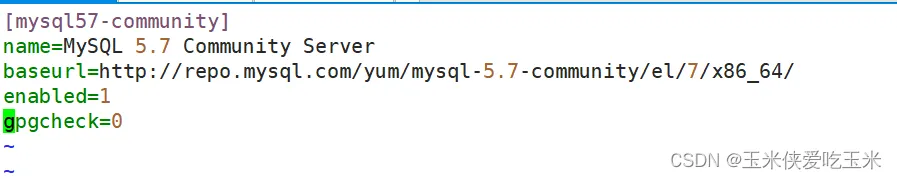 1. [mysql57-community] 2. name=MySQL 5.7 Community Server 3. baseurl=http://repo.mysql.com/yum/mysql-5.7-community/el/7/x86_64/ 4. enabled=1 5. gpgcheck=0
