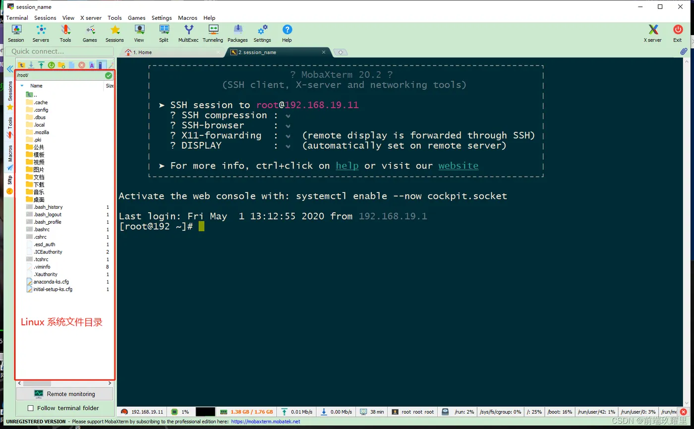本小节介绍了 SSH 网络安全协议,还介绍了两种远程登录 Linux 系统的方法,这两种登录方法都可以对远程 Linux 系统进行命令行操作,使用本地电脑远程登录比较简陋,使用 MobaXterm 软件登录还能显示 Linux 系统的文件夹,并且能使用 sftp 传输文件,两者的远程登录都是基于 SSH 网络安全协议的,从使用命令的角度来说两种方式来说差不多,从功能角度来说, MobaXterm 软件功能较齐全,并且能记住密码,下次直接双击左侧对应连接名即可连接。
