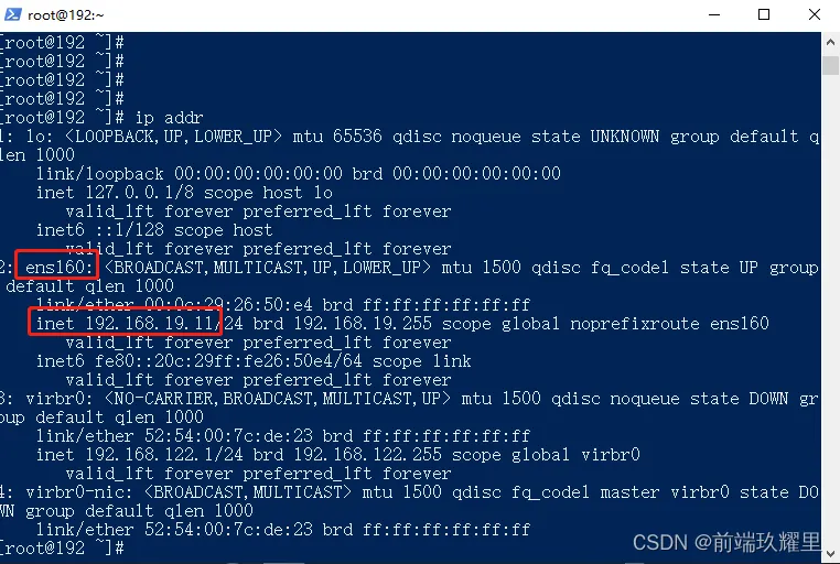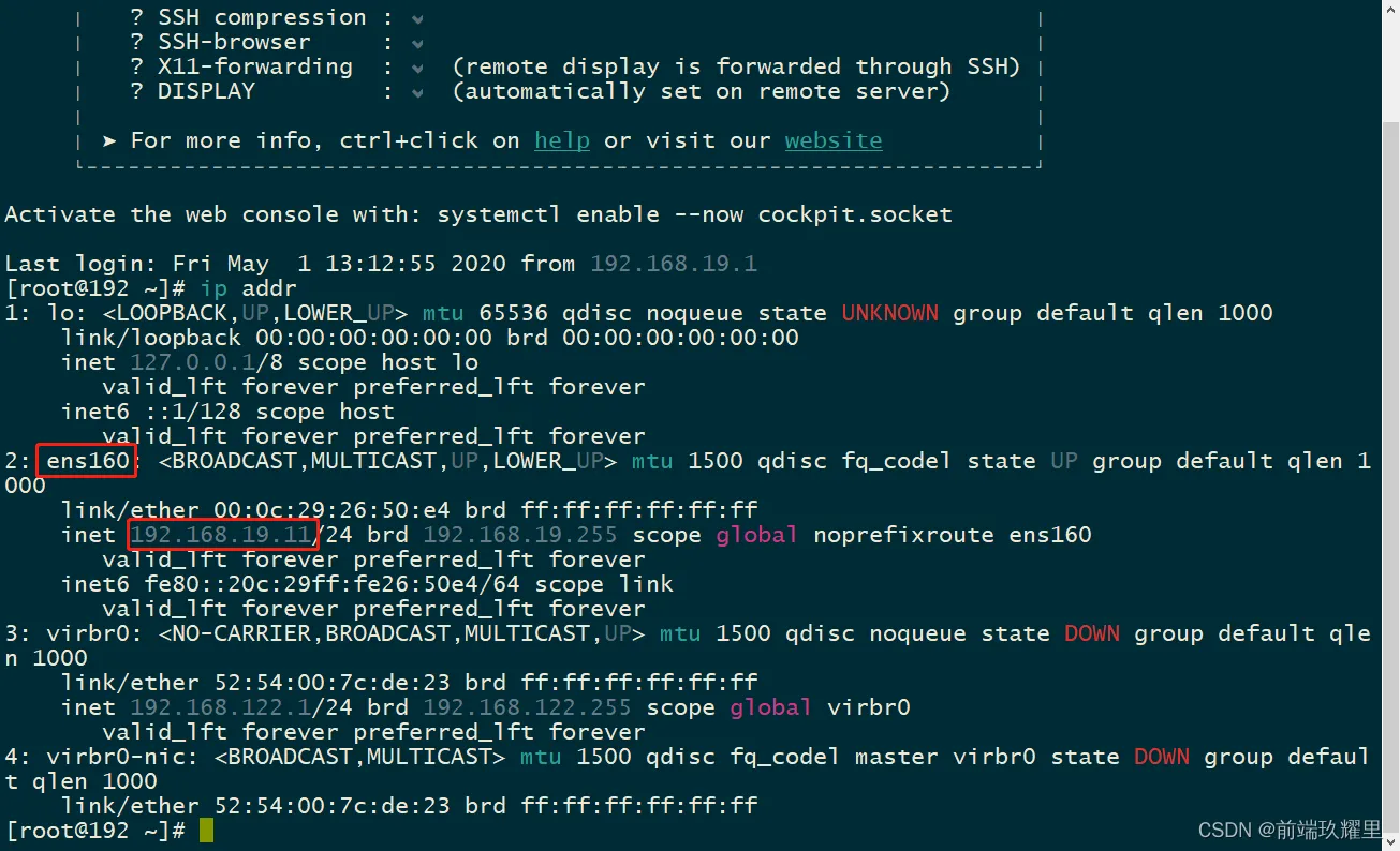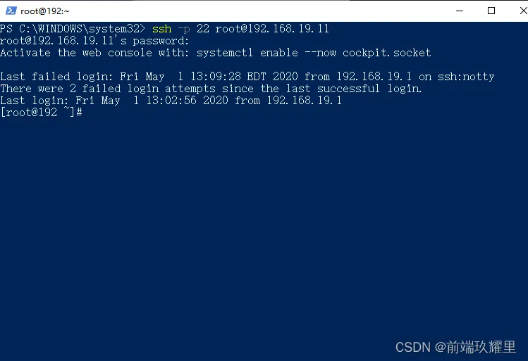 Tips: root 为之前安装的 CentOs 操作系统的超级管理员权限账号,192.168.19.11 为配置好的 ip 地址。
