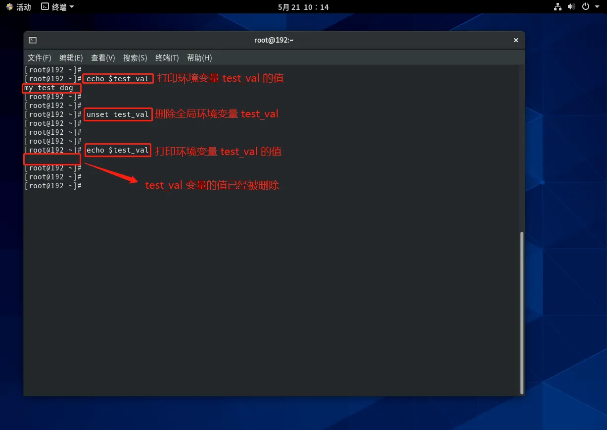 在上小节中,在 /etc/profile 文件中添加的 test_val=my_test_dog 变量是一个全局环境变量,可以使用 unset 命令删除这个全局环境变量,命令如下: