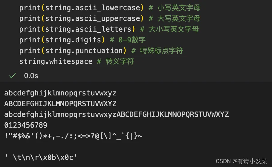 print(string.ascii_lowercase) # 小写英文字母 print(string.ascii_uppercase) # 大写英文字母 print(string.ascii_letters) # 大小写英文字母 print(string.digits) # 0-9数字 print(string.punctuation) # 特殊标点字符 string.whitespace # 转义字符,等打印被视为空白的字符串