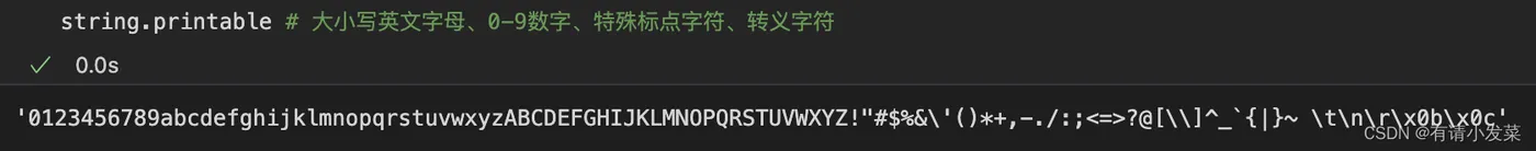 string.printable # 大小写英文字母、0-9数字、特殊标点字符、转义字符,等打印被视为空白的字符串