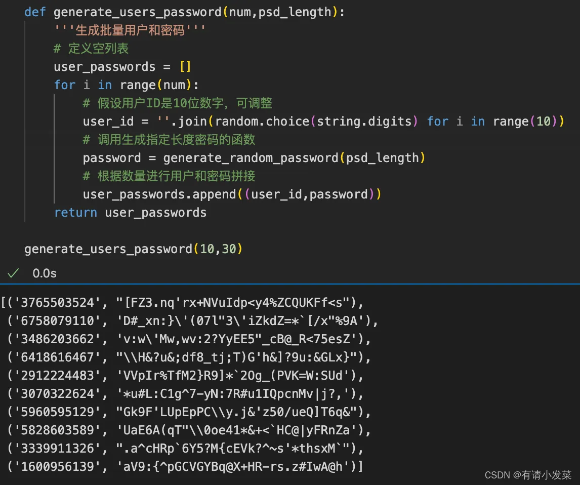 def generate_users_password(num,psd_length): '''生成批量用户和密码''' # 定义空列表 user_passwords = [] for i in range(num): # 假设用户ID是10位数字,可调整 user_id = ''.join(random.choice(string.digits) for i in range(10)) # 调用生成指定长度密码的函数 password = generate_random_password(psd_length) # 根据数量进行用户和密码拼接 user_passwords.append((user_id,password)) return user_passwords generate_users_password(10,30)
