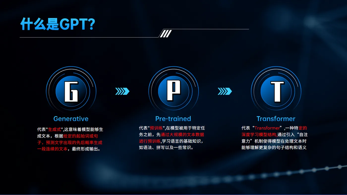 GPT,全称"Generative Pre-training Transformer",是一个由OpenAI开发的自然语言处理(NLP)的模型。它的主要目标是理解和生成人类的自然语言。通过对大规模文本数据进行预训练,GPT模型能学习到语言的各种模式,如语法、句法、一词多义等,以及一些基础的世界知识。