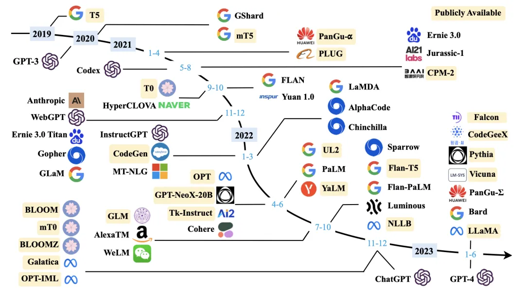 除了OpenAI外,国内外还有非常多的公司参与大模型赛道(国内的报道可以参考晚点发布的「大模型创业潮:狂飙 180 天」,见参考文献15,不过大模型发展太快了,一天一个样,可能等读者看到时,又有新的创业公司加入大模型挑战赛了,或者有更先进、更厉害的模型出现了),下面图2是截止到2023年6月底国内外重要的大模型的发展脉络。