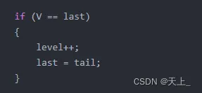 前面我们看到节点1已经出了队列,并被存储在V,判断V == last,如果相等,则表明已经遍历完一层了: