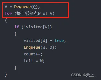 然后开始遍历节点 V 的每个邻接点 W,即与节点 V 相连的节点。