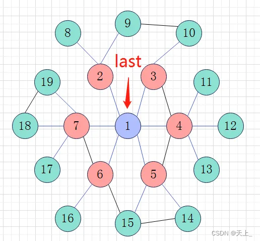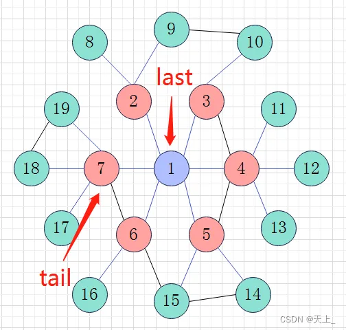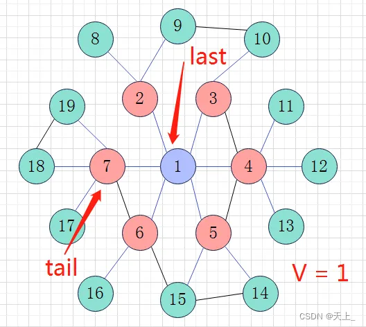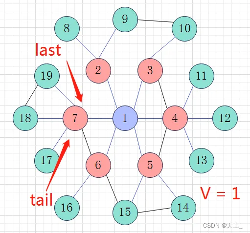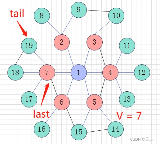 然后开始新一轮的循环,直到来到节点7,节点7的最后一个邻接点赋给tail,即节点19;此时last指向节点7;如此,通过last和tail来判断进入下一层。