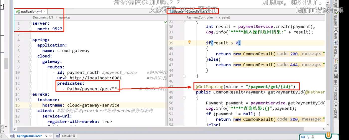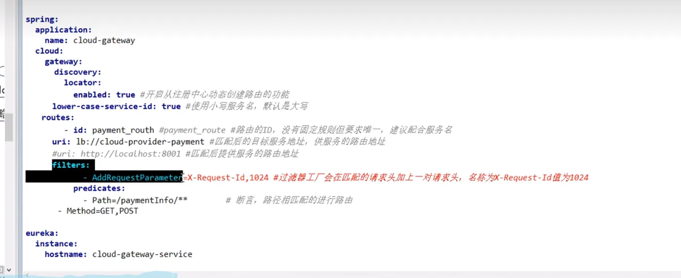 server: port: 9527 spring: application: name: cloud-gateway cloud: gateway: routes: - id: payment_route # 路由的id,没有规定规则但要求唯一,建议配合服务名 #匹配后提供服务的路由地址 uri: http://localhost:8001 predicates: - Path=/payment/get/** # 断言,路径相匹配的进行路由 - id: payment_route2 uri: http://localhost:8001 predicates: - Path=/payment/lb/** #断言,路径相匹配的进行路由 eureka: instance: hostname: cloud-gateway-service client: fetch-registry: true register-with-eureka: true service-url: defaultZone: http://eureka7001.com:7001/eureka/