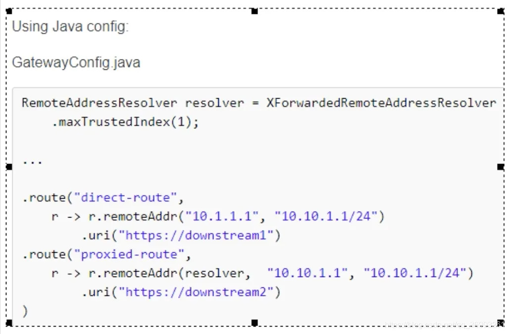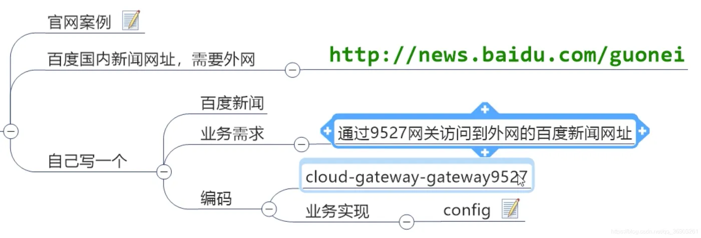 @Configuration public class GatewayConfig { @Bean public RouteLocator customRouteLocator(RouteLocatorBuilder routeLocatorBuilder){ RouteLocatorBuilder.Builder routes = routeLocatorBuilder.routes(); routes.route("path_route_angenin", //id r -> r.path("/guonei") //访问 http://localhost:9527/guonei .uri("http://news.baidu.com/guonei")); //就会转发到 http://news.baidu.com/guonei routes.route("path_route_angenin2", //id r -> r.path("/guoji") //访问 http://localhost:9527/guoji .uri("http://news.baidu.com/guoji")); //就会转发到 http://news.baidu.com/guonji return routes.build(); } // @Bean // public RouteLocator customRouteLocator2(RouteLocatorBuilder routeLocatorBuilder){ // RouteLocatorBuilder.Builder routes = routeLocatorBuilder.routes(); // // routes.route("path_route_angenin2", //id // r -> r.path("/guoji") //访问 http://localhost:9527/guoji // .uri("http://news.baidu.com/guoji")); //就会转发到 http://news.baidu.com/guonji // // return routes.build(); // } }
