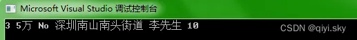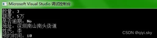 #include <stdio.h> #include <errno.h> struct Client { int amount; char limit[10]; char overdue[5]; char address[20]; char name[10]; int appointment_time; }; typedef struct Client Client; int main() { Client c1 = { 0 }; /*scanf("%d %s %s %s %s %d", &c1.amount, c1.limit, c1.overdue, c1.address, c1.name, &c1.appointment_time);*/ FILE* pf = fopen("test.txt", "r"); if (pf == NULL) { perror("fopen"); return 1; } fscanf(pf, "%d %s %s %s %s %d", &c1.amount, c1.limit, c1.overdue, c1.address, c1.name, &c1.appointment_time); printf("数量:%d\n额度:%s\n是否逾期:%s\n地址:%s\n姓氏:%s\n预约时间:%d", c1.amount, c1.limit, c1.overdue, c1.address, c1.name, c1.appointment_time); fclose(pf); pf = NULL; return 0; }