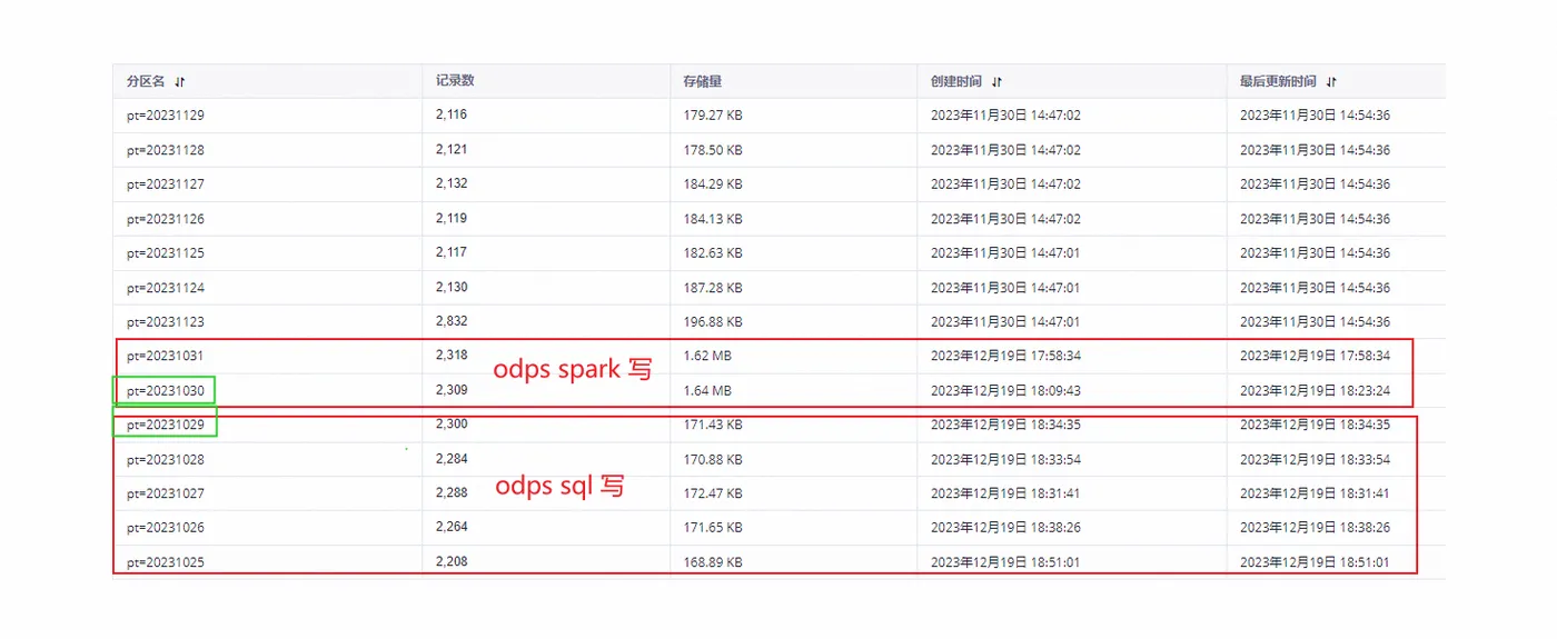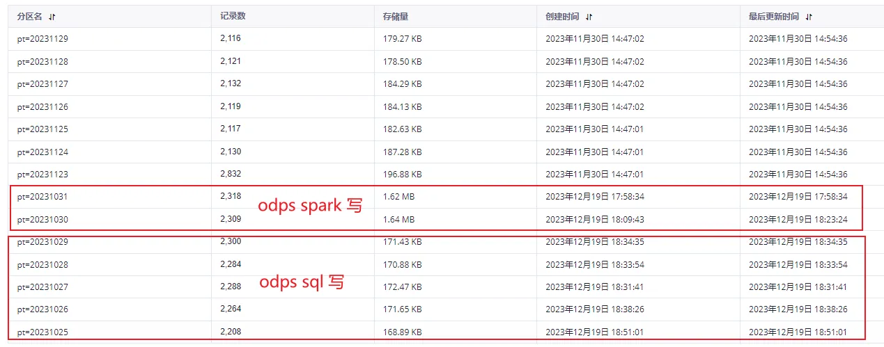 我理解这个不能这么比,底层运行机制、环境都不一样。SQL正常来讲是比较快,这是正常的。MaxComputeSQL的性能本身是要比spark快的,因为存储的问题。可以看一下1029和1030的对比。命令:desc extended sale_detail partition (sale_date='2013');
