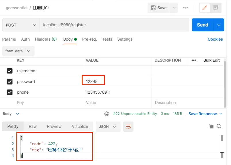 - 后端处理请求(检查手机号位数、手机号是否已经被注册、用户名是否为空)