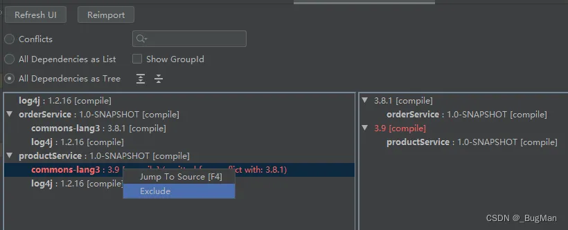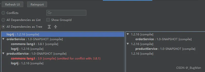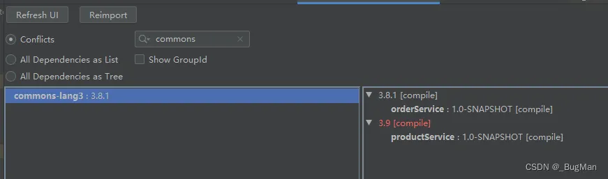 conflicts选项,可以根据依赖名来进行依赖的搜索,搜索结果会展示生效的依赖版本,点击会显示项目中该依赖的所有版本,会用红色标出被冲突掉,不生效的版本: