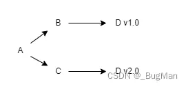应用程序 A 依赖于库 B(版本 1.0)和库 C(版本 1.0)。