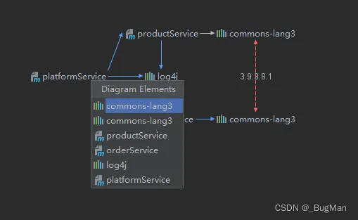 蓝色箭头是正常的依赖关系,红色箭头是依赖冲突关系。