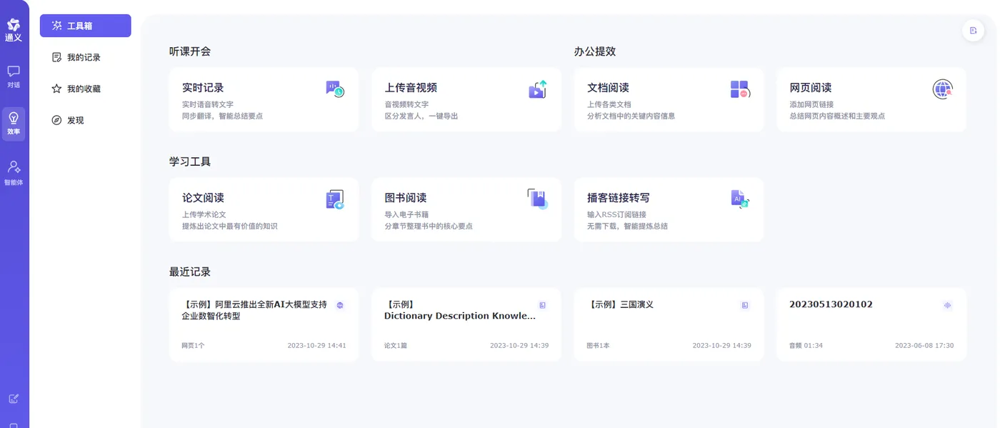 当然也会用到实时会议记录以及翻译的工具,通义听悟,可以极大的释放在开会过程中记录会议记录的痛苦,方便会议结束之后整理,同时可以自动归纳会议核心议题等