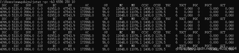 监控 gc ,每三行输出一次表头,监控的程序 pid 为 6556 ,没250ms 输出一次,一共 10 次。
