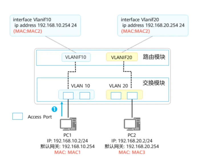 查找ARP表查到192.168.20.2、获取该地址的MAC地址,交由交换模块重新封装为数据帧。交换模块查找MAC地址表以明确报文出接口、是否需要携带VLAN Tag。最终交换模块发送的数据帧:源MAC为VLANIF20的MAC,目的MAC为PC2的MAC,剥离VLAN Tag发送。
