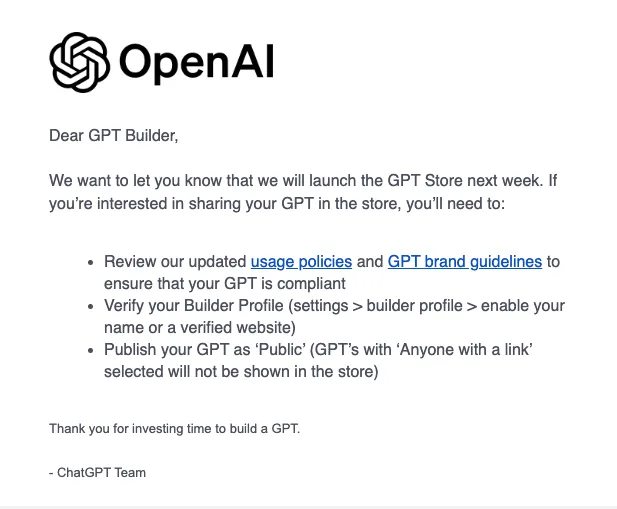 OpenAI已经向那些已经通过GPT Builder创建和启动了自定义GPT的人发送了一封电子邮件,包括本文作者,电子邮件正文如下: