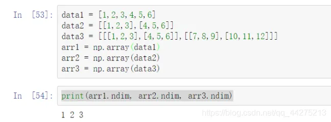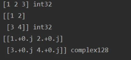 a = [1,2,3] b = np.array(a) c = np.array([[1,2],[3,4]]) d = np.array([[1,2],[3,4]],dtype=complex) # 指定数据类型 print(b , b.dtype) print(c , c.dtype) print(d , d.dtype)