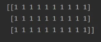 array_one = np.ones([3, 10], dtype=np.int) print(array_one)