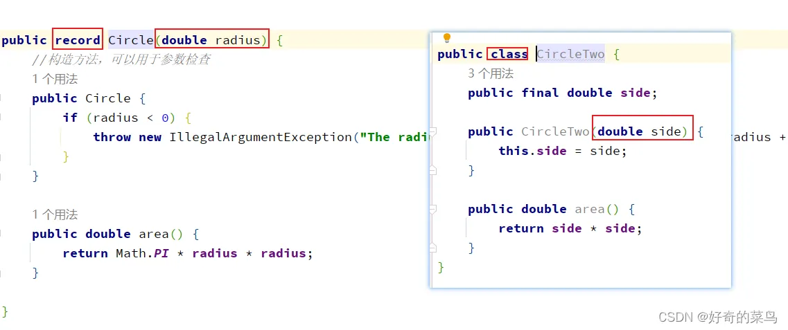 public record Circle(double radius) { //构造方法,可以用于参数检查 public Circle { if (radius < 0) { throw new IllegalArgumentException("The radius of a circle cannot be negative [" + radius + "]"); } } public double area() { return Math.PI * radius * radius; } }