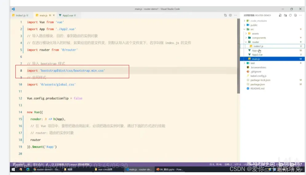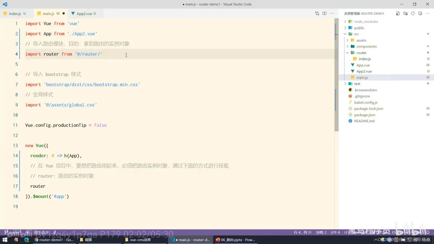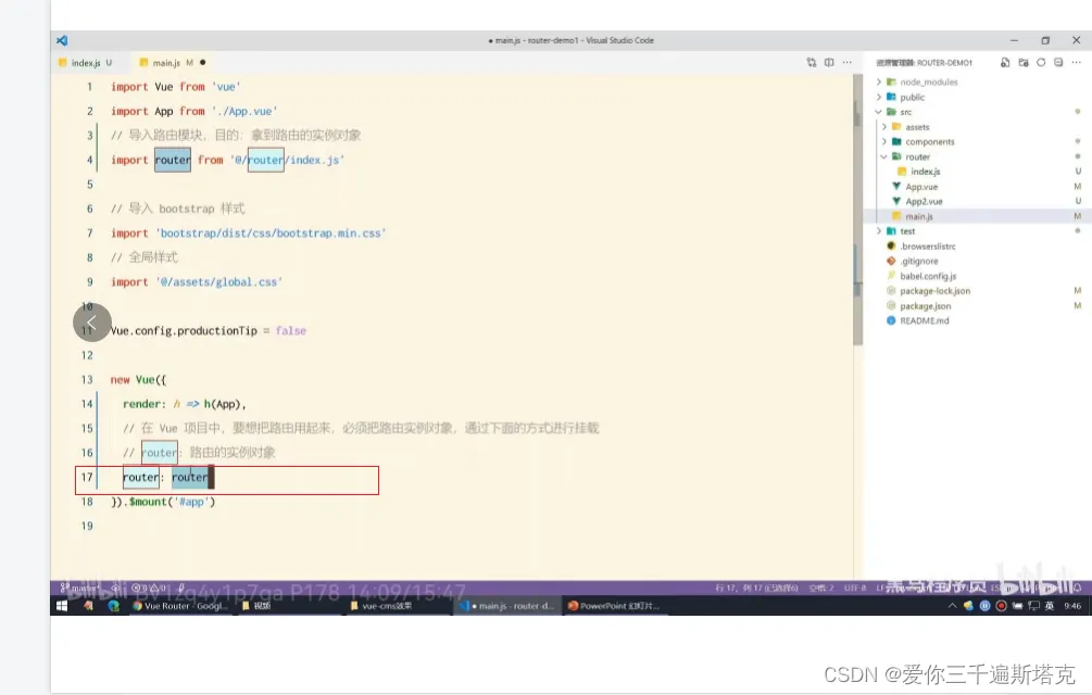10、导入路由模块和实例对象,然后在main.js文件进行导入: