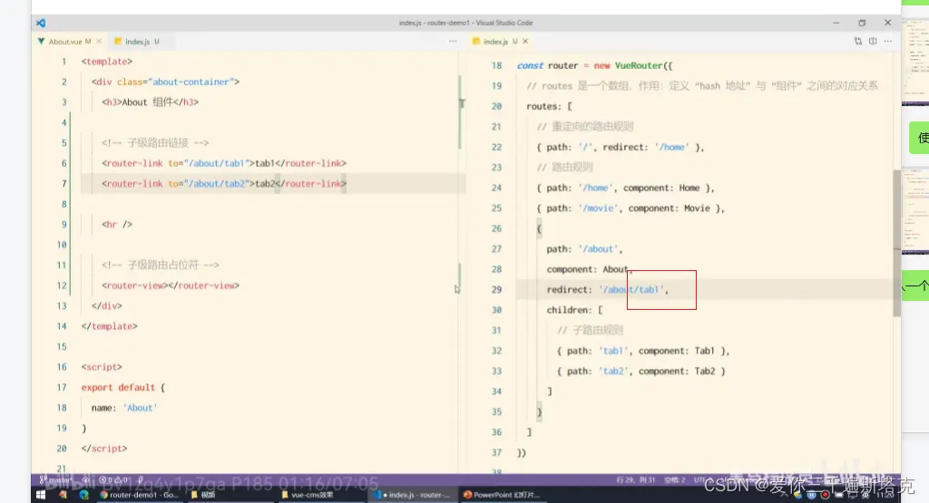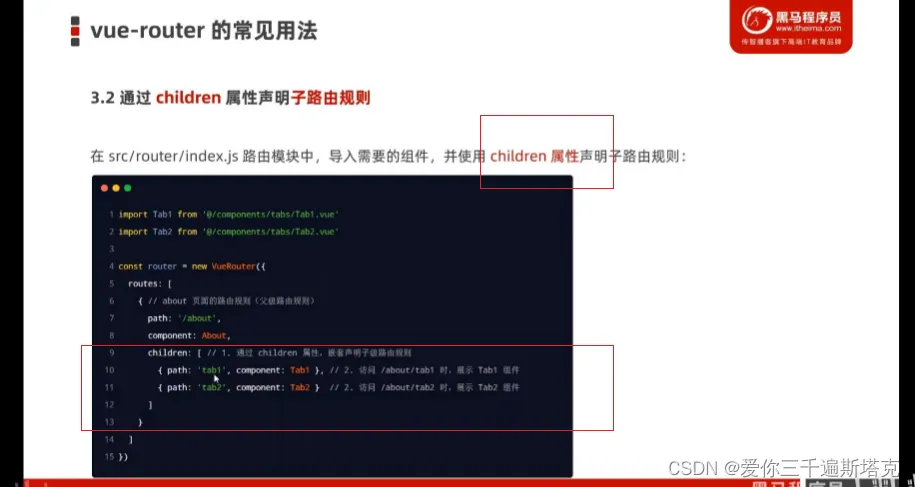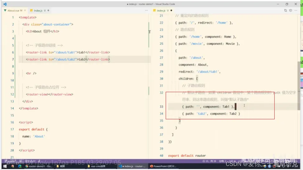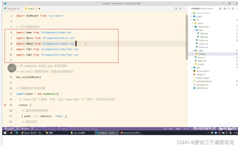 22、子路由规则的规则不要加/,注意嵌入子路由先导入包,在index.js文件中导入包: