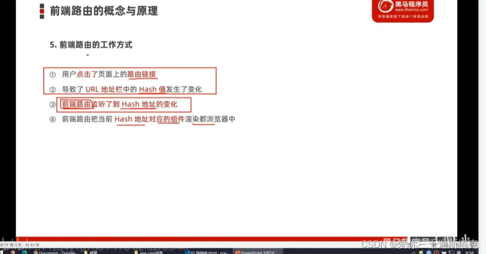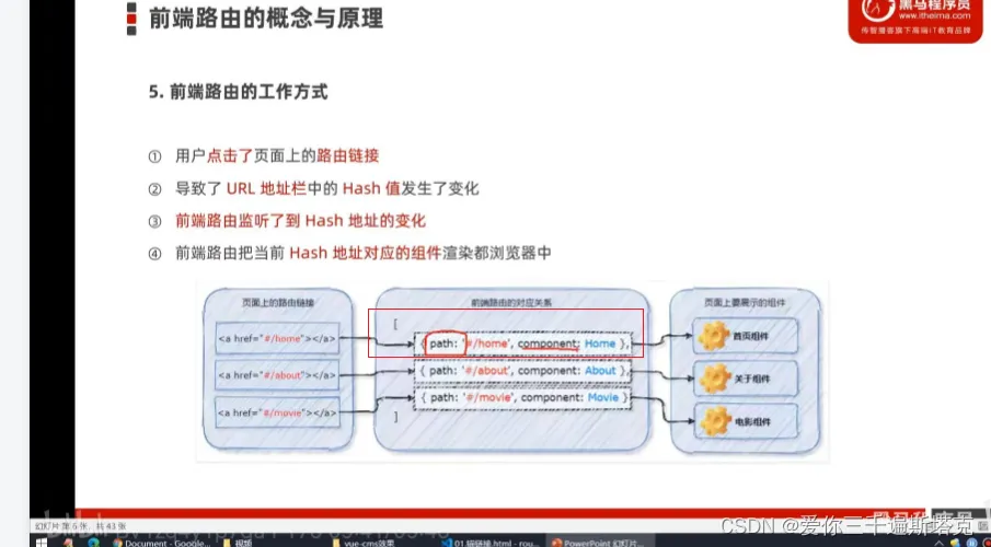 5、前端路由的工作方式:前端路由只要发生变化,hash地址就能发生变化,前端路由本质上的对应关系是hash地址和组件的对应关系