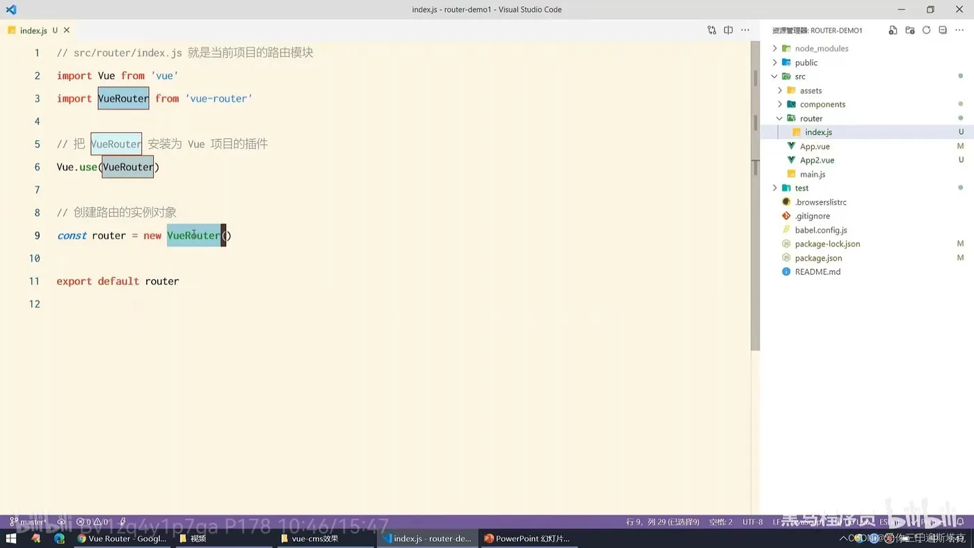 9、在项目中创建一个router文件,再创建一个index.js文件,里面配置如下