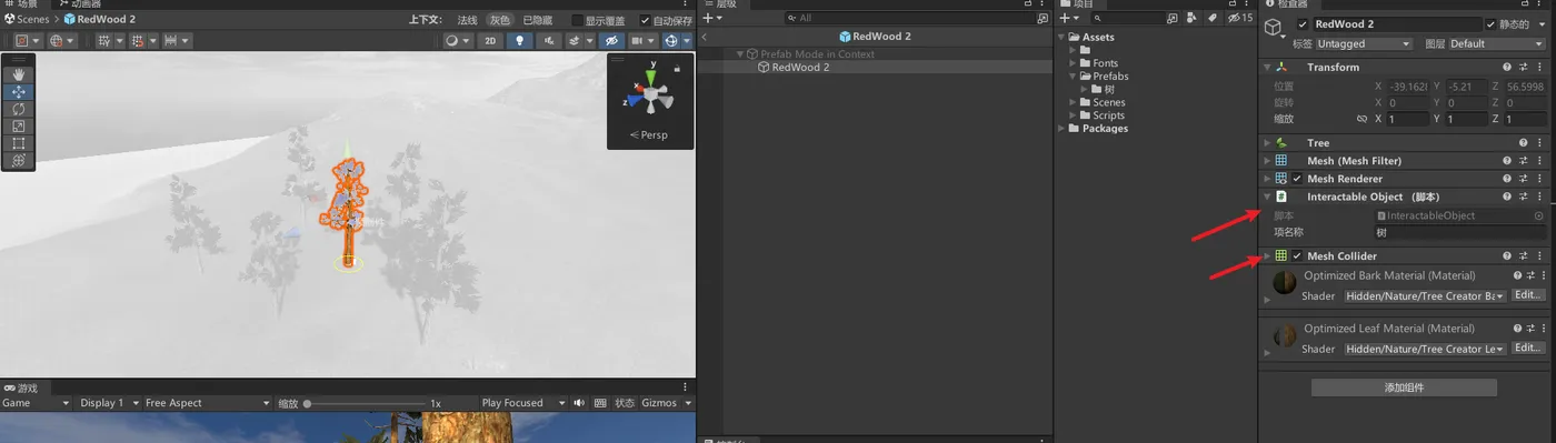 比如我们在树预制体上挂载脚本,记得添加碰撞体
