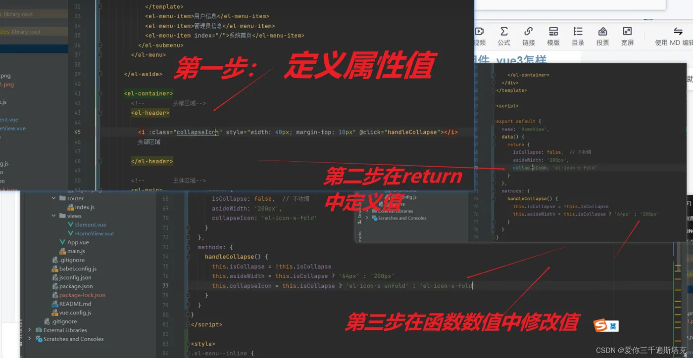 定义一个isCollapse判断显不显示,this顺序很重要,有时候点了一下没反应,按照下面的顺序