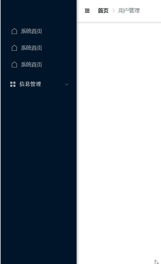 <template> <div> <el-container> <el-aside :width="asideWidth" style="min-height: 100vh; background-color: #001529" > <div style=" height: 60px; color: white; display: flex; align-items: center; justify-content: center; " > <!-- <img src="@/assets/logo.png" style="width: 60px;height: 10px;"> <span class="logo-title" v-show="!isCollapse">零一</span> --> </div> <el-menu :collapse="isCollapse" style="border: none" background-color="#001529" text-color="rgba(255,255,255,0.65)" default-active="$router.path" > <el-menu-item index="/"> <el-icon> <House /> </el-icon> <span>系统首页</span> </el-menu-item> <el-menu-item> <template #title> <el-icon> <House /> </el-icon> <span>系统首页</span> </template> </el-menu-item> <el-menu-item> <template #title> <el-icon> <House /> </el-icon> <span>系统首页</span> </template> </el-menu-item> <el-sub-menu index="1-4"> <template #title> <el-icon> <Menu /> </el-icon> <span>信息管理</span> </template> <el-menu-item index="1-4-1">用户信息</el-menu-item> </el-sub-menu> </el-menu> </el-aside> <el-container> <el-header> <el-icon @click="handleCollapse"> <component :is="Expand" v-if="isCollapse"></component> <component :is="Fold" v-else></component> </el-icon> <el-breadcrumb :separator-icon="ArrowRight" style="margin-left:20px"> <el-breadcrumb-item :to="{ path: '/' }">首页</el-breadcrumb-item> <el-breadcrumb-item :to="{ path: '/' }">用户管理</el-breadcrumb-item> </el-breadcrumb> </el-header> <el-main> </el-main> </el-container> </el-container> </div> </template> <style scoped> .el-menu--inline { background-color: #000c17 !important; } .el-menu--inline .el-menu-item { background-color: #000c17 !important; } .el-menu-item:hover, .el-sub-menu__title:hover span { color: #fff !important; } .el-sub-menu__title:hover i { color: #fff !important; } .el-menu-item.is-active { background-color: #40a9ff !important; color: #fff; border-radius: 5px !important; margin: 4px !important; width: calc(100% -8px); margin-left: 4px; } .el-menu-item.is-active i, .el-menu-item.el-menu-item.is-active .el-tooltip { margin-left: -4px; } .el-menu-item { height: 40px !important; line-height: 40px !important; margin: 4px !important; } .el-submenu__title { height: 40px !important; line-height: 40px !important; margin: 4px !important; } .el-aside { transition: width .3s; box-shadow: 2px 0 6px rgba(0,21,41,.35); } .el-header { box-shadow: 2px 0 6px rgba(0,21,41,.35); display: flex; align-items: center; } .el-aside div .img { width: 30px; } .el-aside div span { font-size: 14px; font-family: "Times New Roman", Times, serif; font-weight: 700; } .logo-title { margin-left: 5px; font-size: 20px; transition: all 0.3s; } </style> <script setup> import { House, Menu, Fold, Expand, ArrowRight} from "@element-plus/icons-vue"; </script> <script> export default { name: "HomeView", data() { return { isCollapse: false, asideWidth: "200px", flag:true }; }, methods: { handleCollapse() { this.isCollapse = !this.isCollapse; this.asideWidth = this.isCollapse ? "64px" : "200px"; }, }, }; </script>