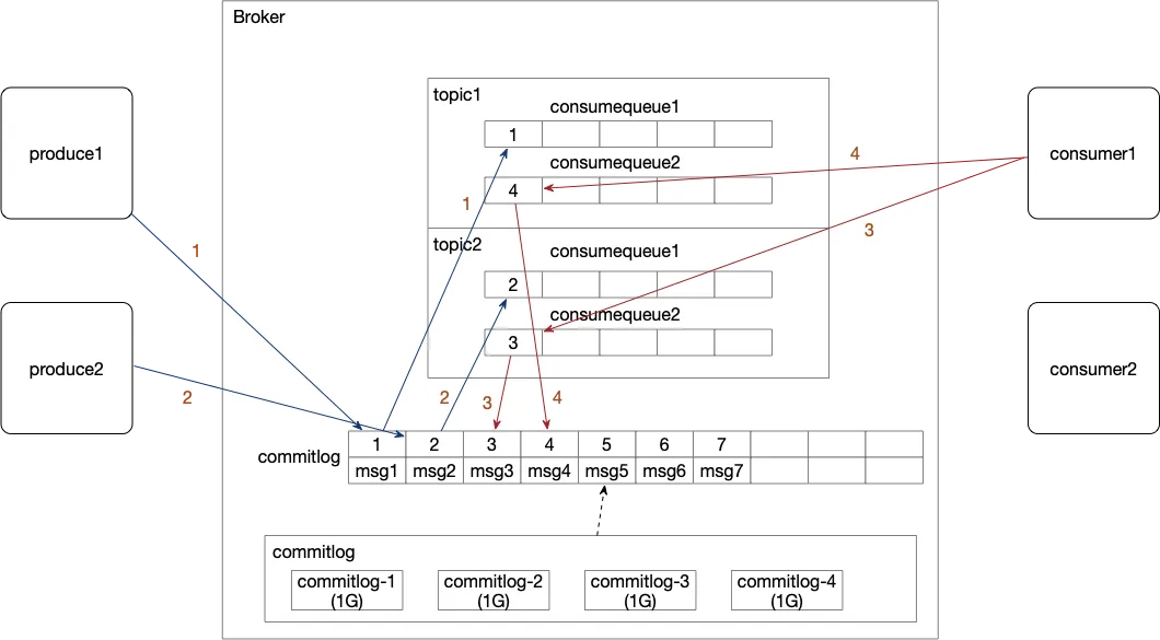 在MetaQ中,消息的存放分为物理队列和逻辑队列。物理队列一般用commitlog来表示,而逻辑队列则一般用consumequeue来表示。