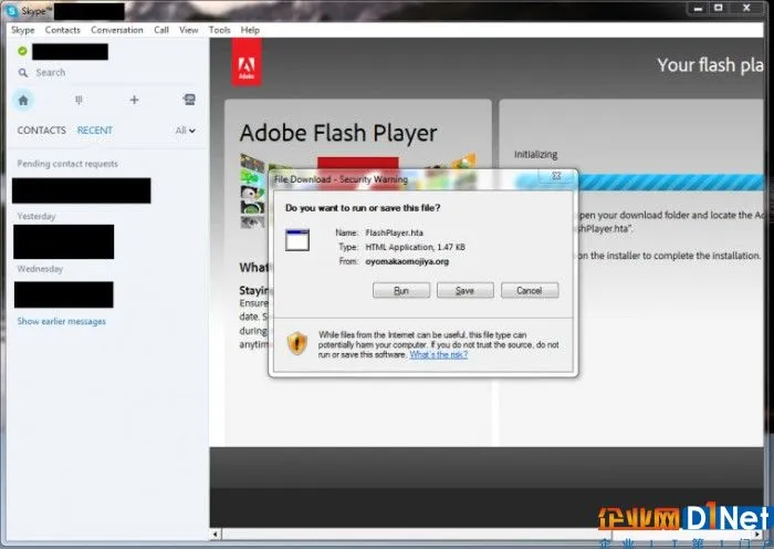 许多用户抱怨Skype一直在托管流氓广告,这很可能会让用户感染恶意软件。上个星期三,这个问题被提交到reddit,原始的帖子表示,他的Skype主屏幕上出现恶意广告,这个广告伪装成电脑浏览器的Flash更新,并且提示用户下载一个名为“FlashPlayer.hta”的HTML应用程序,这个应用程序看起来像一个合法的程序。然而,一旦打开,它将下载恶意的有效载荷,这可能会对用户电脑造成长期的有害影响。