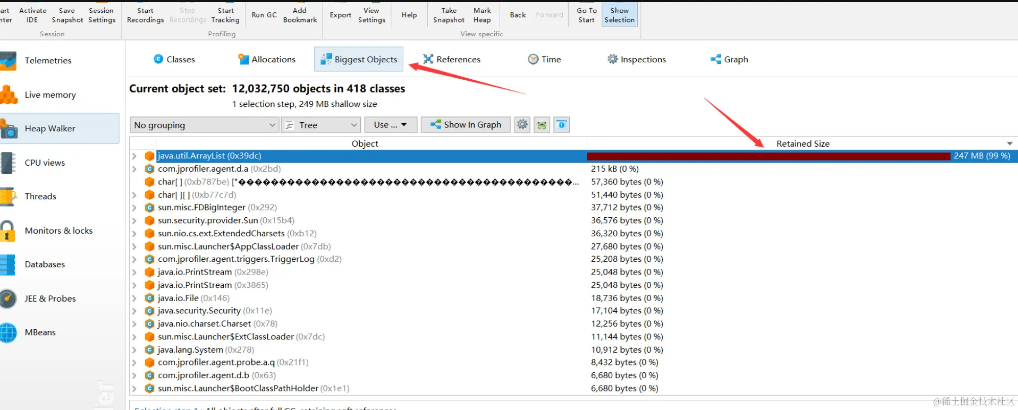 (3)使用上面下载好的JProfiler打开生成的单个快照