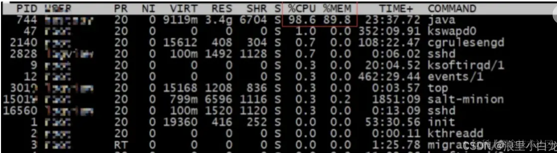 (1)我们可以先通过 top -c查看当前服务器进程并记录当前消耗cpu最高线程的pid。