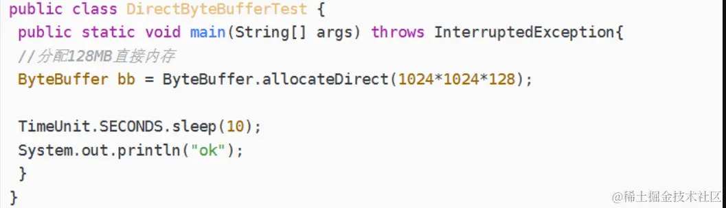 ByteBuffer分配128MB直接内存,而JVM参数-XX:MaxDirectMemorySize=100M指定最大是100M,因此发生直接内存溢出。