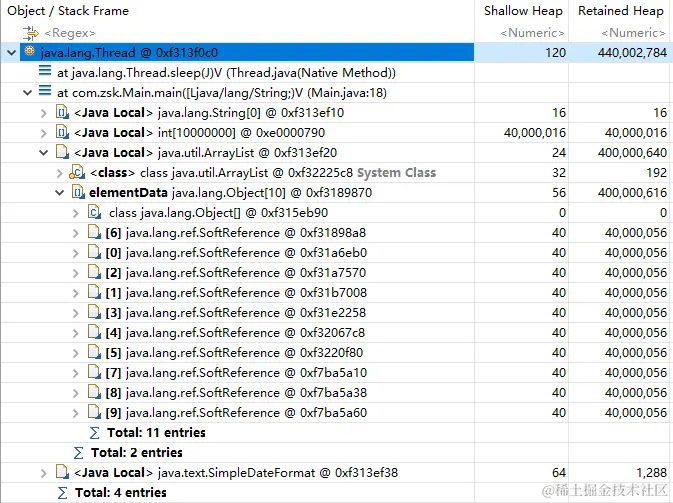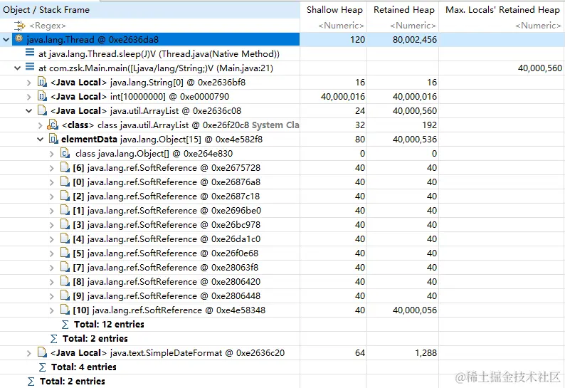 可以清楚的看到了ArrayList中的软引用的引用对象(大数组)都被回收掉了,也验证了该类上的注释:在抛出OOM之前,也就是堆内存使用完之前,将所有的弱引用的引用对象给回收。
