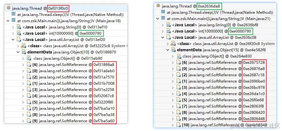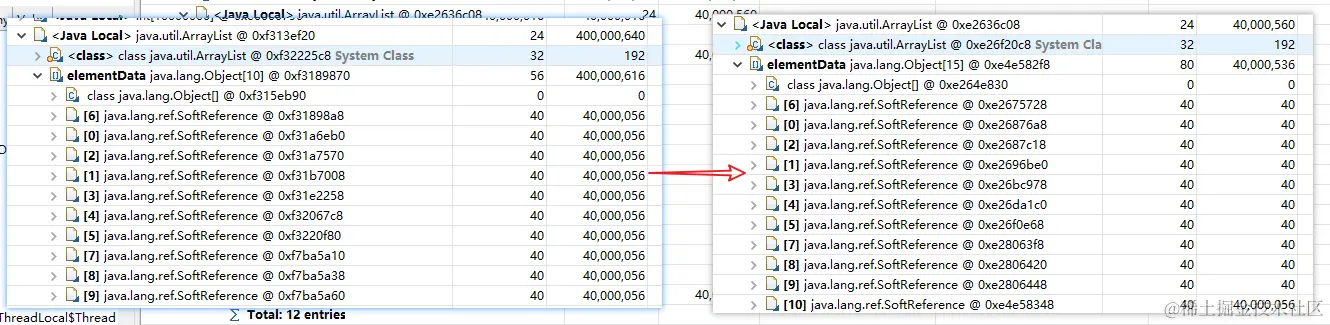 看到对比图,可能有个疑问,为什么ArrayList中弱引用对象的地址变动了呢?